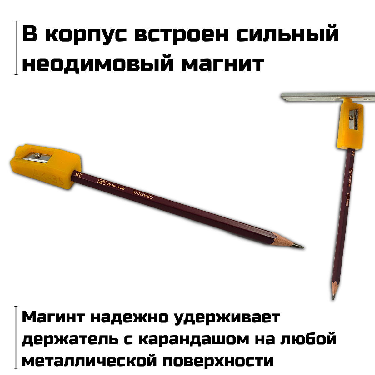Держатель для карандаша — это стильный и практичный аксессуар, который гарантирует, что ваш карандаш всегда будет под рукой. Встроенная точилка помогает быстро подточить карандаш, а сильный неодимовый магнит надёжно удерживает его на любой металлической поверхности, исключая риск потери. Прорезиненный корпус держателя предотвращает скольжение и обеспечивает дополнительное удобство в использовании. С держателем от Черон ваш карандаш всегда будет на месте и готов к работе!