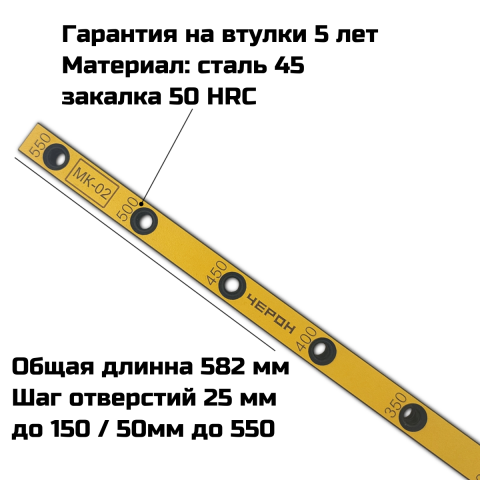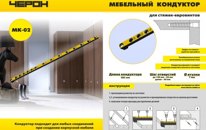 - Мебельный кондуктор кондуктор МК-02 предназначен для сверления отверстий 7 мм в торце плиты 16 мм с шагом отверстий 25/50 мм. (можно сверлить плиты и другой толщины с использованием переходников)