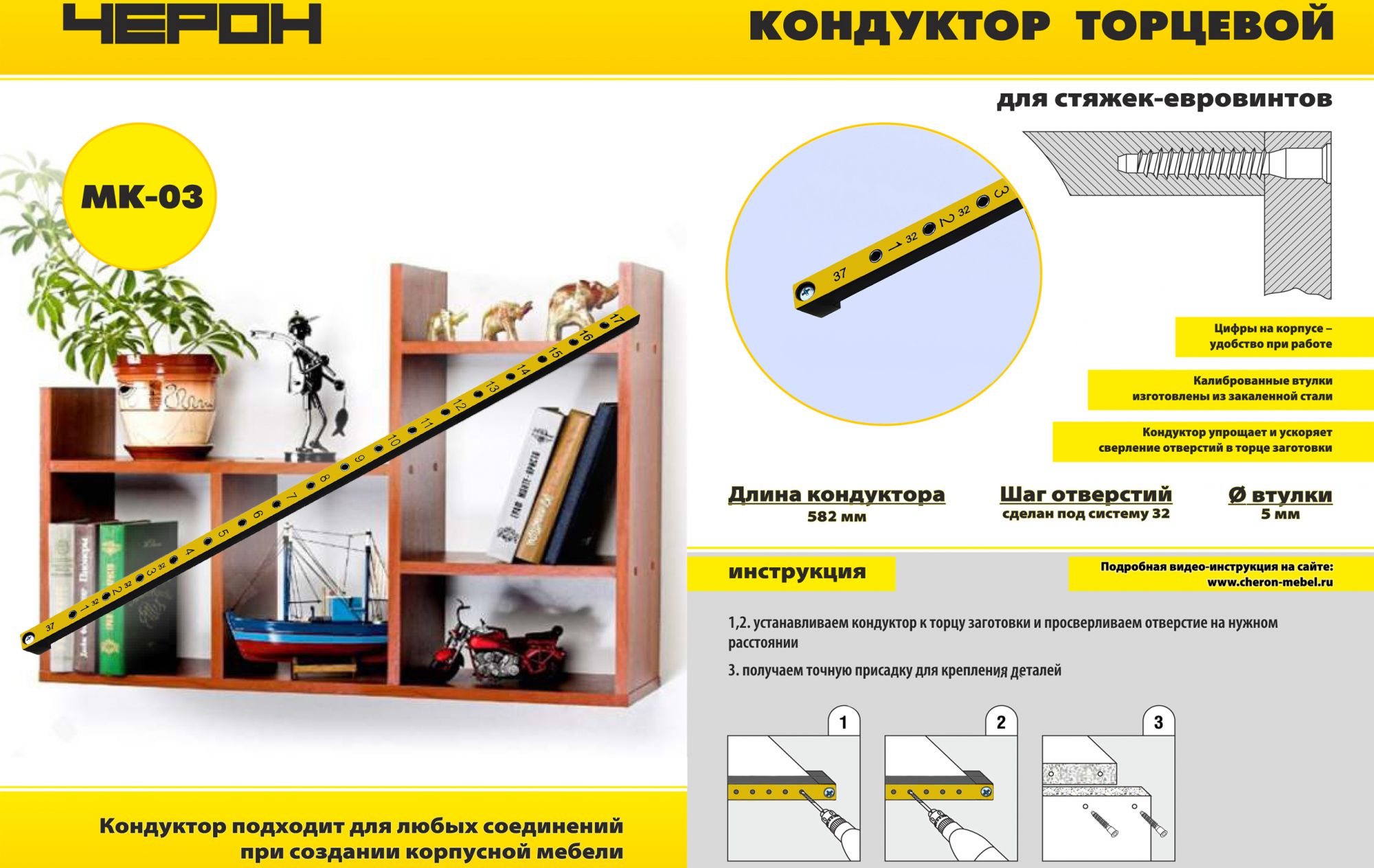 - Мебельный кондуктор кондуктор МК-03 предназначен для сверления отверстий 5 мм в торце плиты 16 мм с шагом отверстий 32 мм. (можно сверлить плиты и другой толщины с использованием переходников)