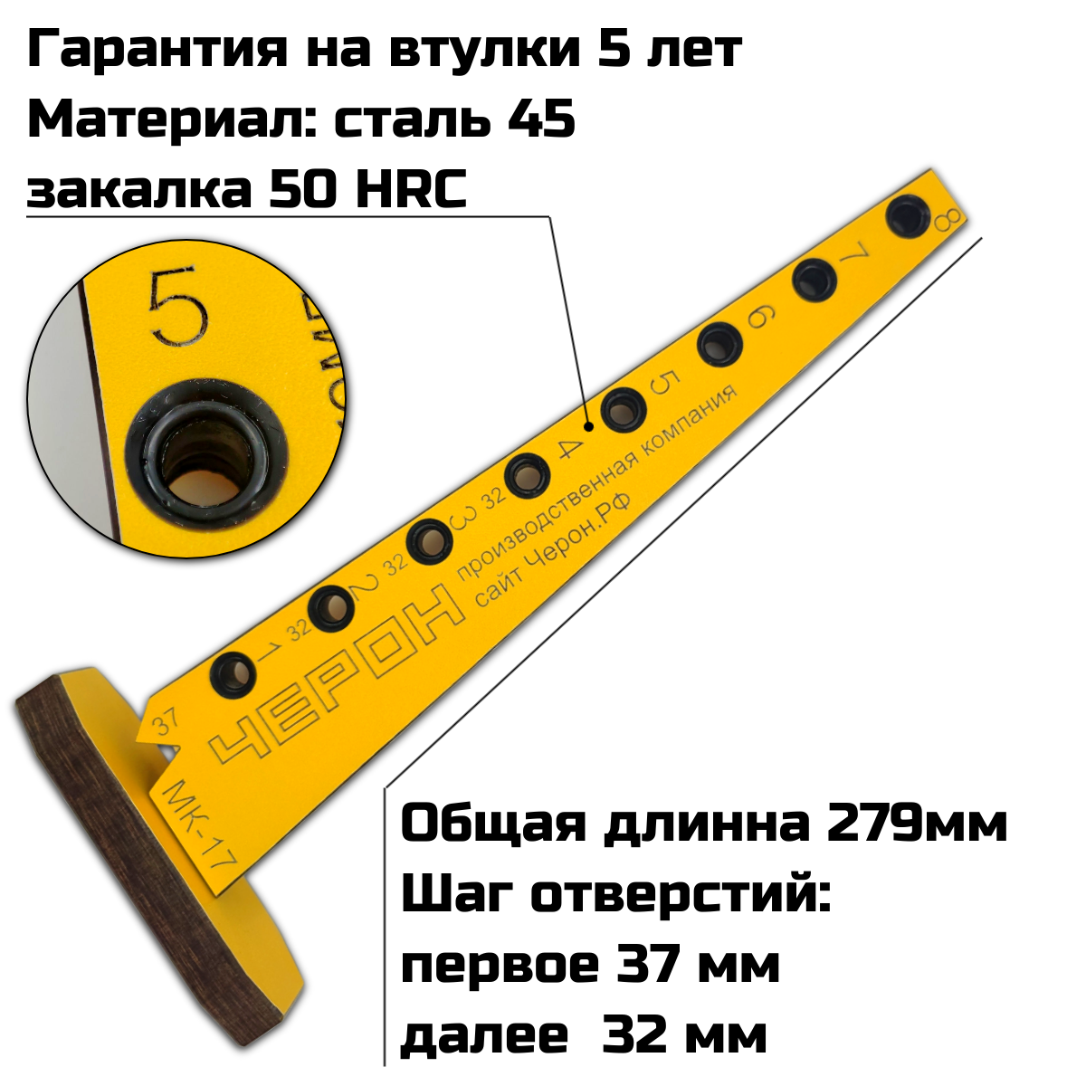 - Мебельный кондуктор угольник укороченный МК-17 предназначен для сверления отверстий 7 мм в плоскость плиты 16 мм с шагом отверстий 32 мм. (можно сверлить плиты и другой толщины с использованием переходников)