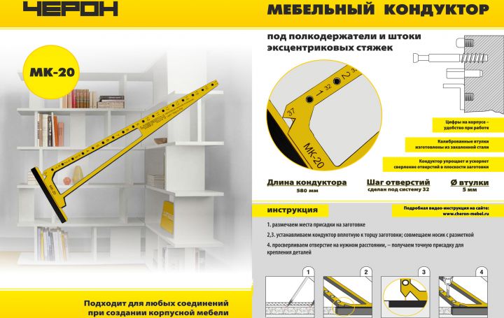 - Мебельный кондуктор угольник МК-20 предназначен для сверления отверстий 5 мм в плоскость плиты 16 мм с шагом отверстий 32 мм. (можно сверлить плиты и другой толщины с использованием переходников)