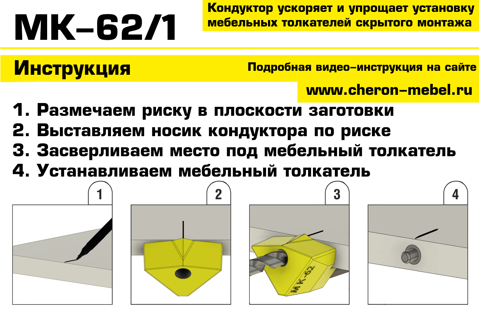 Мебельный кондуктор МК-62/1 для плиты 18 мм., разработанный производственной компанией «Черон», предназначен для облегчения и повышения точности установки мебельных толкателей скрытого монтажа типа push to open. Этот инструмент значительно упрощает процесс сверления отверстий под установку толкателя, делая монтаж быстрым и профессиональным. В комплекте с кондуктором поставляется сверло диаметром 10 мм., что позволяет сразу приступить к работе без необходимости подбора дополнительных аксессуаров.