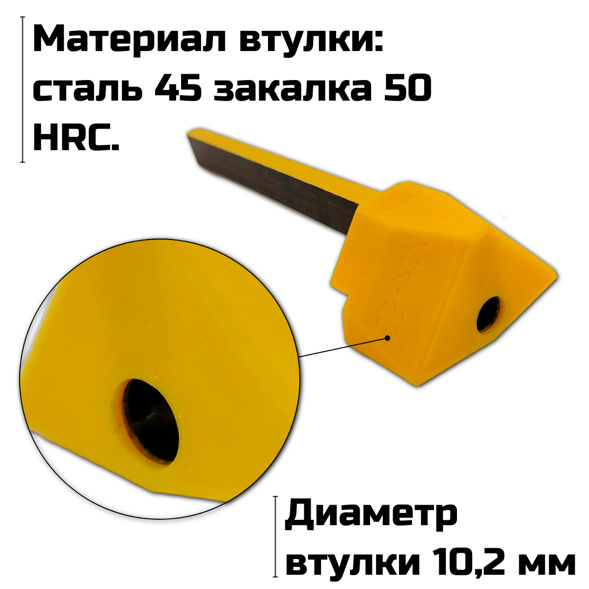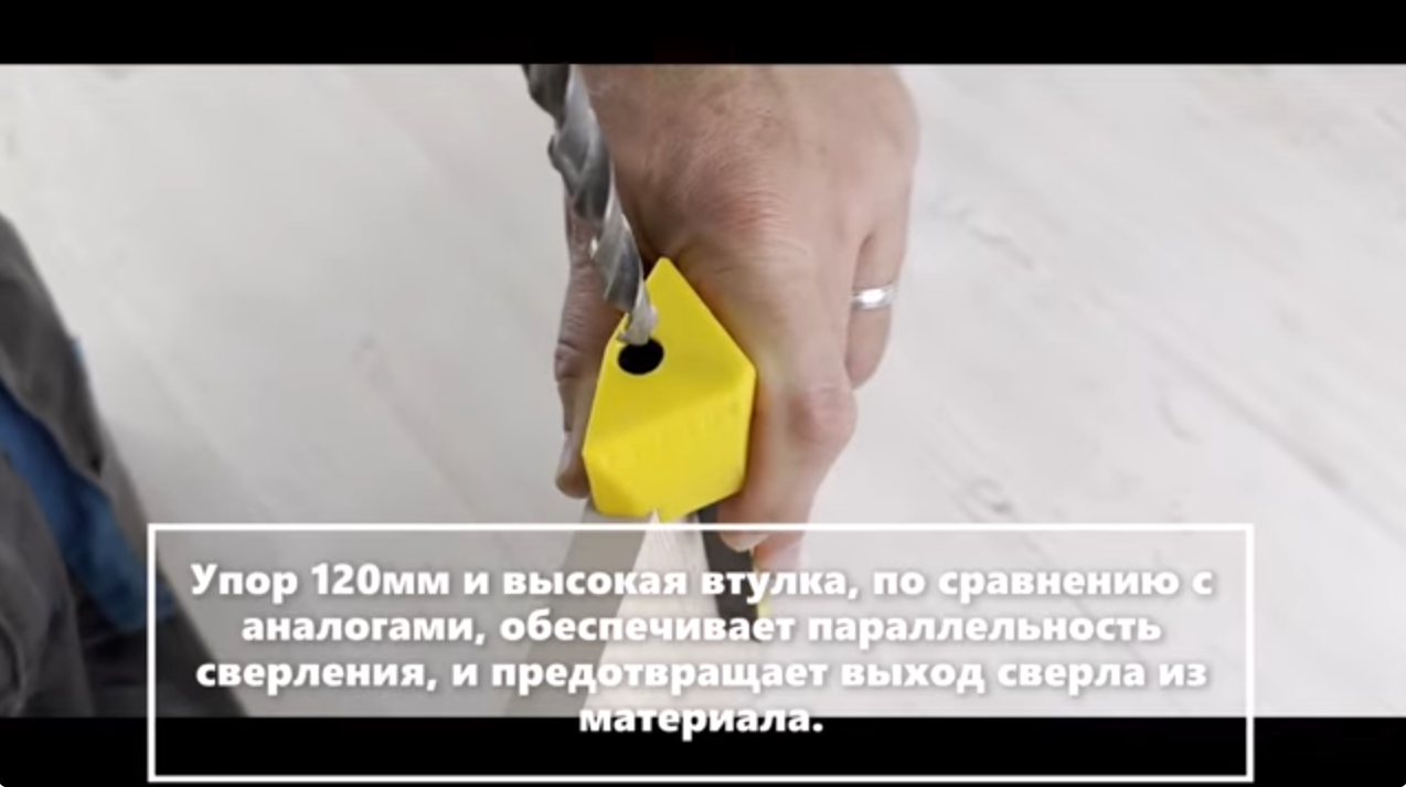Кондуктор оснащен закаленной втулкой диаметром 10 мм., что обеспечивает надежность и долговечность инструмента, позволяя ему выдерживать многократные циклы сверления без потери точности. Основной корпус выполнен из биоразлагаемого пластика, что делает инструмент прочным и экологически безопасным.