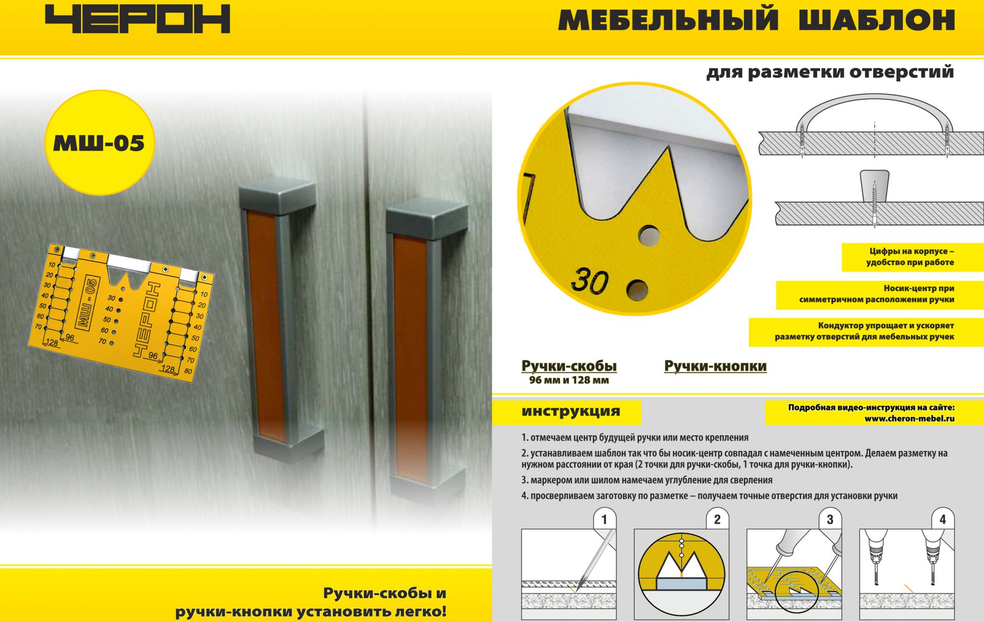 МШ-05 - шаблон разработан для разметки отверстий под различные типы мебельных ручек, включая ручки-кнопки, ручки-скобы и ручки-рейлинги. Благодаря нашему универсальному шаблону, вы можете легко и точно разметить отверстия для ручек размерами 96 и 128 мм.