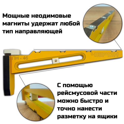 Приспособление для всех видов направляющих ПН-46 – это полностью российская разработка компании ЧЕРОН. Шаблон разработан как аналог более дорогим устройствам зарубежного производства, чтобы еще больше мебельщиков смогли выполнять эту задачу, при этом не переплачивая за западный бренд.
